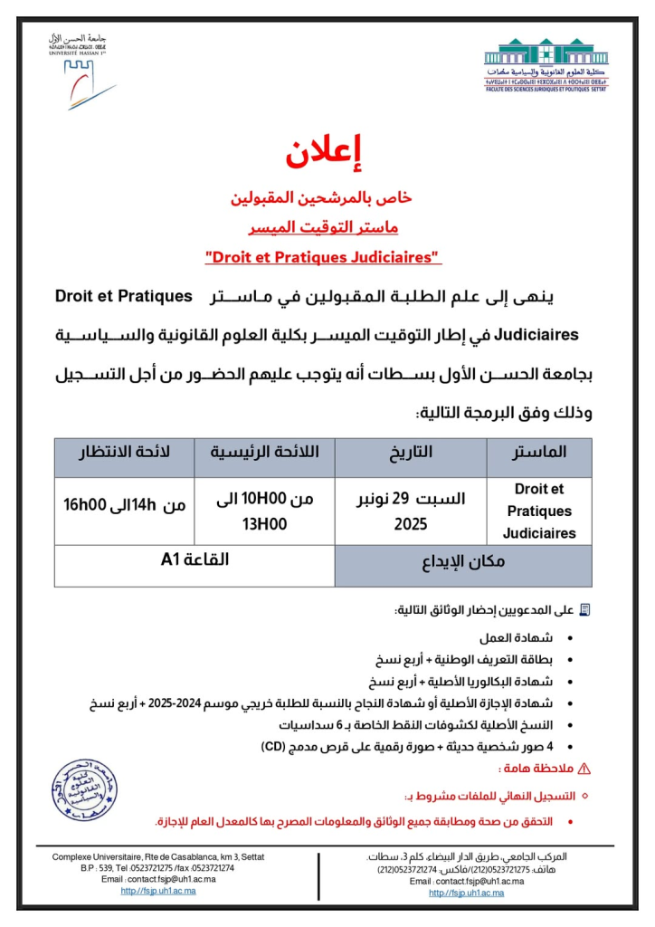 • اعلان خاص بالمترشحين المقبولين – ماستر التوقيت الميسر – droit et pratiques judiciaires